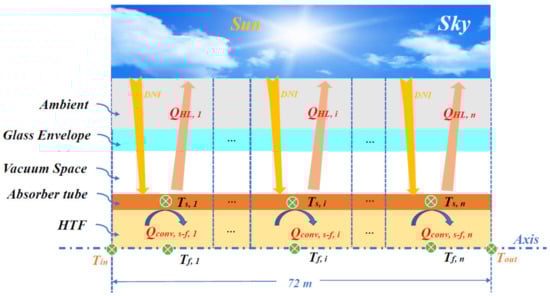 Detail heat loss models of conventional HCEs (CHCEs) and NHCEs have been presented in our previous study [], thus no more repetitive introductions are conducted in this paper. Here, energetic and exergetic efficiency models used to simulate overall performance of NHCEs in a real PTC system are established by employing a volume unit method. The heat collecting process in the 72 m PTC system is exhibited in Figure 4, 72 m loop is divided into n control volumes (n = 144) for accurately calculating overall performance of the HCEs in the PTC system. For per control volume (i) under quasi steady state, the fluid temperature and absorber temperature are marked as Tf,i and Ts,i (i = 1, …, n), the heat loss (HL) from the HCE and the amount of convection heat transfer between the absorber tube and the HTF are expressed as QHL,i and Qconv,s-f,i. Qconv,s-f,i is written as follows []: