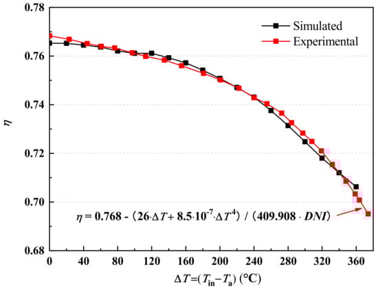 It has been proved in previous study that the simulated heat loss had a good agreement with experimental data carried out by National Renewable Energy Laboratory []. In this paper, the simulated energetic efficiency results implemented by the C++ language program (Visual C++ 11.0, Microsoft, Redmond, Washington, USA, 2012) are compared with experimental data from outdoor testing carried out by Valenzuela et al. []. All parameters used in simulation are same with parameters in experiments, namely, DNI of 864 W/m2, ambient temperature of 32.8 °C, and HTF flow rate of 3 kg/s. The simulated and experimental energetic efficiencies are presented in Figure 5. It is noted that the units of variable of (ΔT) and Qsolar is °C and W/m2, respectively. In this study, root-mean-square deviation (RMSD) and mean bias error (MBE) [] are employed to verify the simulation precision. MBE is expressed as follows:
