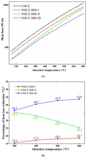 As shown in Figure 6b, the percentages of heat loss reduction in NHCE-IRR-I, NHCE-IRR-II, and NHCE-IRR-III reach 18.7%, 25.3%, and 43.8% at the absorber temperature of 600 °C, which demonstrate that the greatest potential of IR-reflector for the reduction of heat loss in HCE is 43.8% at this absorber temperature. Therefore, the application of IR-reflectors in the HCEs has great potential to improve the thermal performance.