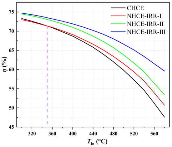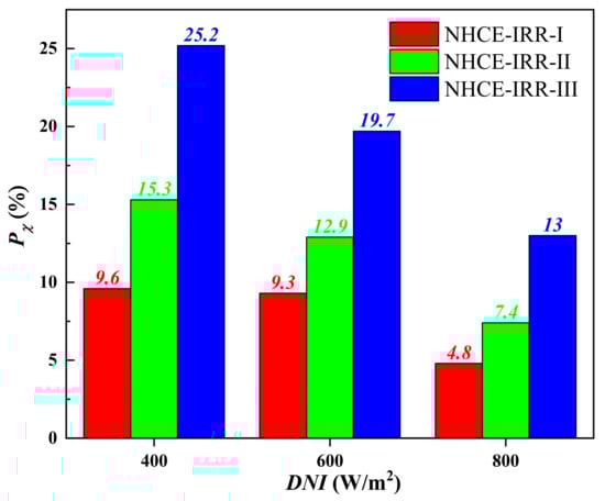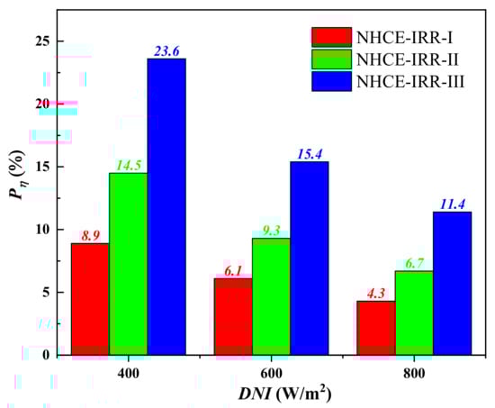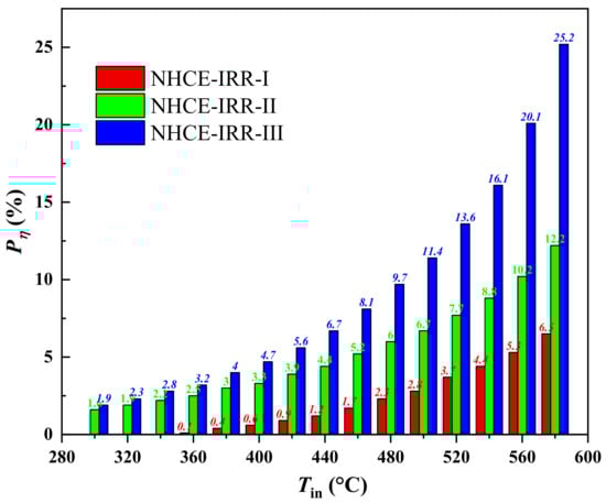 As shown in Figure 8, the percentages of energetic efficiency enhancement (Pη) of three NHCEs obviously grow with the increasing operating temperature; the percentage values in NHCE-IRR-I, NHCE-IRR-II, and NHCE-IRR-III reach 6.5%, 12.2%, and 25.7% at the inlet temperature of 580 °C.