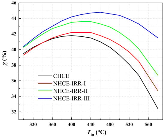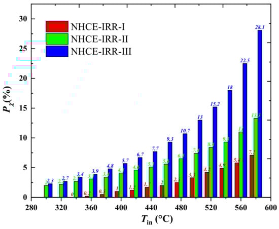 As shown in Figure 10, the percentages of exergy efficiency enhancement (Pχ) of three NHCEs obviously grow with the increasing inlet temperature, the percentage values of NHCE-IRR-I, NHCE-IRR-II, and NHCE-IRR-III reach 7.1%, 13.3%, and 28.1% at the inlet temperature of 580 °C, respectively.