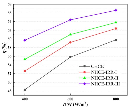 The energetic efficiency of the PTC system with different HCEs versus DNI is shown in Figure 11. It can be seen that the gap between the energetic efficiency of NHCE and that of the CHCE is gradually reduced with the increasing DNI from 400 W/m2 to 800 W/m2, which is also proved in Figure 12. The percentages of energetic efficiency enhancement of NHCE-IRR-I, NHCE-IRR-II, and NHCE-IRR-III at the DNI of 800 W/m2 are 4.3%, 6.7%, and 11.4%, respectively.