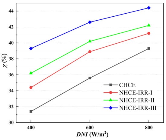 Percentage of exergetic efficiency enhancement of NHCEs versus DNI.