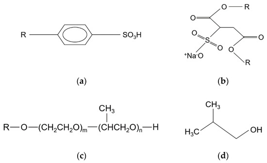 - Yada, S.; Suzuki, T.; Hashimoto, S.; Yoshimura, T. Adsorption and aggregation properties of homogeneous polyoxypropylene–polyoxyethylene alkyl ether type nonionic surfactants. Langmuir 2017, 33, 3794–3801. [Google Scholar] [CrossRef]