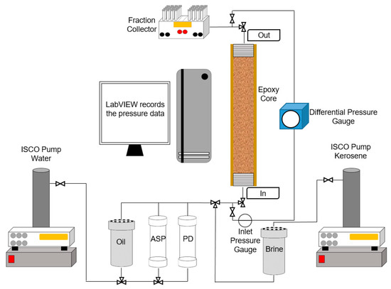 where indicates the volume of the ASP injected into the sandstone core. The injection volumetric velocity was maintained at 0.24 mL/min (approximately 1 ft/day superficial velocity).
