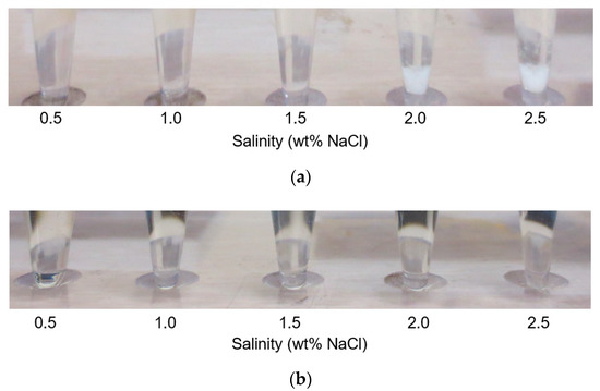 Figure 3 presents the results of the aqueous stability test. The test group included the nonionic surfactant (LB-95), while the reference group had heavy alcohol (IBA) added into the base the ASP mixture (0.25 wt% 1:4 (wt/wt) of the LAS and DOSS anionic surfactant pair, 0.2 wt% Na2CO3 as the alkali, and 0.15 wt% HPAM as the polymer). The amount of chemical added was 0.2 wt%. The proposed mixture (nonionic surfactant) did not show any precipitation until 2.5 wt% NaCl (Figure 3b) while the reference mixture (heavy alcohol) started precipitation from 2.0 wt% NaCl (see the solid-like white materials at 2.0 and 2.5 wt% NaCl in Figure 3a). This aqueous stability test showed that to compare the two cases, we have to maintain a salinity below 2.0 wt% NaCl, and thereby the proposed nonionic surfactant could apply up to 2.5 wt% NaCl, but the applicability of heavy alcohol would be limited below 2.0 wt% NaCl.