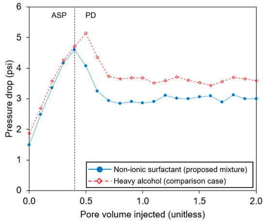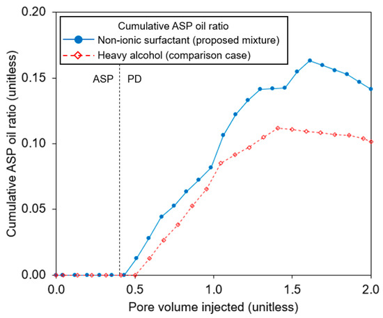 Figure 6 compared the oil cut and the cumulative oil recovery after pre-flush. The cumulative oil recovery of the nonionic surfactant addition was about 74% of the residual oil after waterflooding, while that of the comparison remained at 51%. The oil cut of the proposed mixture showed a late-time recovery while that of the comparison case showed one highest peak and then a sharp decrease. The trajectories in the proposed mixture confirmed the effectiveness of the polymer drive. Figure 7 depicted CAOR to examine the efficiency of the ASP flooding. The CAOR of the nonionic surfactant addition was much higher than that of the heavy alcohol, and, thereby, the nonionic surfactant helped to recover the residual oil with better efficiency (Figure 7).