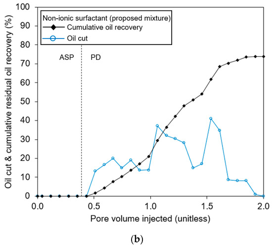 Oilcut and cumulative oil recovery after pre-flush: (a) the reference case (heavy alcohol); (b) the proposed case (the nonionic surfactant) mixing with 0.25 wt% 1:4 (wt/wt) of LAS and DOSS anionic surfactant pair, 0.2 wt% Na2CO3 as the alkali, and 0.15 wt% HPAM as the polymer.