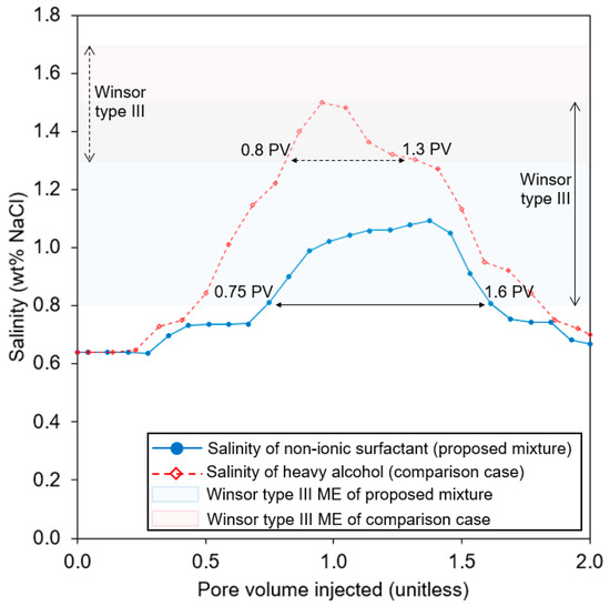 Figure 4 shows a salinity scan test with Winsor type III microemulsion and solubilization ratio to determine the optimum salinity. The proposed mixture with a nonionic surfactant showed a lower optimum salinity and wider range of the type III zone than the reference case. The optimum salinity with the same solubilization ratio of oil and water was 1.1 wt% NaCl for the proposed mixture and 1.7 wt% NaCl for the reference case. The figures on the left side of Figure 4 (Figure 4a,c) revealed that the add-on of the nonionic surfactant resulted in a larger amount of Winsor type III than the reference case, which could be effective in making the residual oil moveable. The solubilization ratio at the optimum salinity was 16 mL/mL for the proposed mixture and 18 mL/mL for the reference. They were over the criterion to obtain an ultralow interfacial tension, i.e., 1.17 × 10−3 mN/m and 0.93 × 10−3 mN/m (Table 4; [20,36]). Table 4 summarizes the results of the salinity scan test; a notable result is the difference of optimum salinity. The proposed case (AS with nonionic surfactant) showed the reduced value of optimum salinity favorable at the low salinity environment. The coreflooding test is required to evaluate the difference of solubilization ratios, as well as the optimum salinities influencing residual oil recovery.