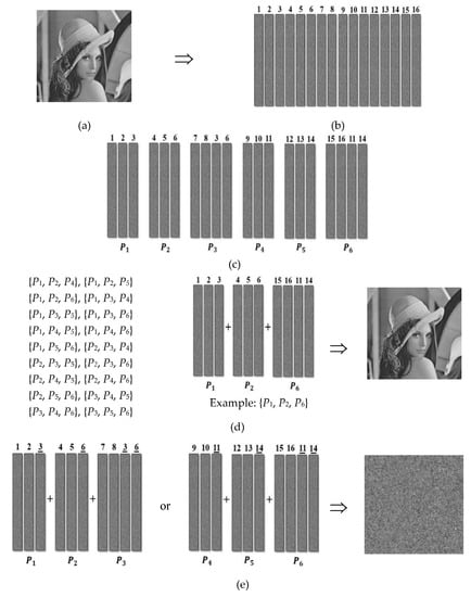 Sharing and decryption experiment of Example 2, which is a (tparticipants = 3, nparticipants = 6, f = 2) example with 2 forbidden combinations. (a) is original image; (b) uses (tartificial, nartificial) = (9, 16) in traditional sharing to share (a) and create 16 shares; (c) creates 6 shadows for the 6 participants P1 to P6 by assigning the 16 shares in (b) to them; (d) shows that each of the 18 combinations can reveal the secret. Here, the combination {P1, P2, P6} is used as example; (e) shows that the 2 forbidden combinations cannot reveal the secret because each combination gets less than 9 shares.