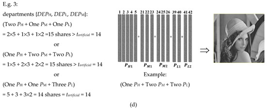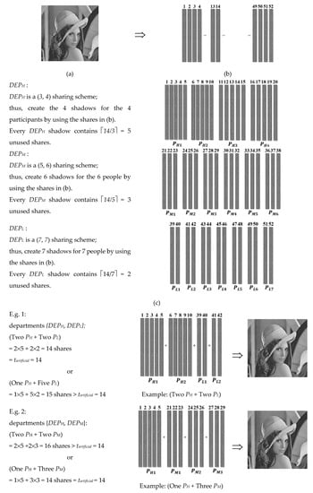 Fourth, cross-department-supported sharing is different from progressive sharing [,,]. In progressive sharing, the unveiling of the secret decreases in error to finally become error free. In cross-department-supported sharing, the unveiling of the secret is either error free or completely nothing (100% vs. 0%). In words, the secret disclosure of progressive sharing crosses several resolutions of image quality, whereas the secret disclosure of the cross-department support type crosses participants from several departments.
