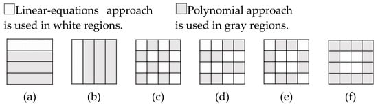 Six of the almost infinitely many examples of sharing a secret image by mixing the two approaches. (a) means that only the top quarter can use linear-equations approach (LEA); (b) means that only the leftmost quarter can use LEA; (c) means that only the blocks (i,j) whose i + j are even can use LEA; (d) means that only blocks {1, 2} of each odd row and blocks {3, 4} of each even row can use LEA; (e) means that only the top-leftmost, top-rightmost, bottom-leftmost, bottom-rightmost, and the 4 central blocks can use LEA; (f) means that only the 4 central blocks can use LEA.