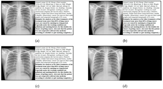 Figure 4 gives an example of this kind of application. Figure 4a is the original 512 × 1024 lung X-ray and medical chart image of a patient. We may use (tparticipants, nparticipants) = (2, 4) sharing to share the image among 4 doctors {D1–D4}. The left half (the X-ray image) can be viewed by the cooperation of any two doctors. However, for the right half of the image, due to the sensitivity of the medical history, and also due to the fact that doctors D1 and D2 are brothers, we may particularly forbid the disclosure of the medical history if only these two brothers attend the disclosure meeting. Therefore, the left half image is shared using traditional sharing without any forbidding, i.e., (tparticipants, nparticipants, f) = (tartificial, nartificial, f) = (2, 4, 0). However, the right half image is shared using (tparticipants, nparticipants, f) = (2, 4, 1) with only one forbidden combination, namely {D1, D2}. Figure 4b,c show the disclosed image obtained by doctors {D1, D3} and {D2, D4}, respectively. Both Figure 4b,c are identical to Figure 4a. However, if {D1, D2} try to disclose the image, they only get Figure 4d.