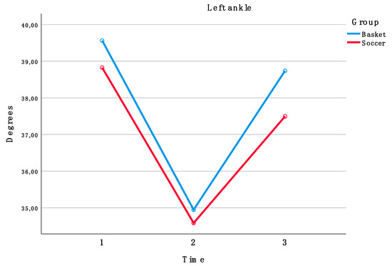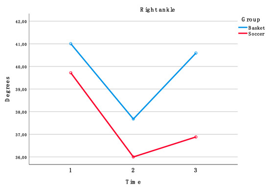 Regarding Table 1, the height and weight showed significant differences (p < 0.05) between groups. For the soccer group, significant differences were observed for the right ankle [F (2,32) = 7.558; p = 0.002 (0.321)] and left ankle [F (2,32) = 9.813; p = 0.001 (0.380)], but no differences for the asymmetry variable. The basketball group reported significant differences for the right ankle [F (2,36) = 17.687; p = 0.001 (0.496)], the left ankle [F (2,36) = 35.204; p = 0.001 (0.662)] and the symmetry [F (2, 36); p = 0.001 (0.247)]. (Table 2) The Bonferroni corrections showed significant differences (p < 0.05) in the soccer group’s right and left ankle between the baseline and pre-training and between the baseline and post-training moments for the right ankle whereas for the basketball group significant differences (p < 0.05) were shown for the right and left ankle between baseline and pre-training and in the right and left ankle between pre-training and post-training (Table 3).
