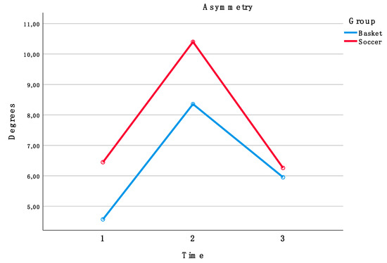 In addition, the interaction time x group showed significant differences for the asymmetry [F (2, 68) = 0.415; p = 0.002 (0.012)]. (Figure 1, Figure 2 and Figure 3) The Bonferroni corrections for the interaction between groups reported significant differences (p < 0.05) for the right ankle, the left ankle and the asymmetry variables between baseline and pre-training moments and the left ankle as well as the asymmetry between pre-training and post-training moments (Table 4).