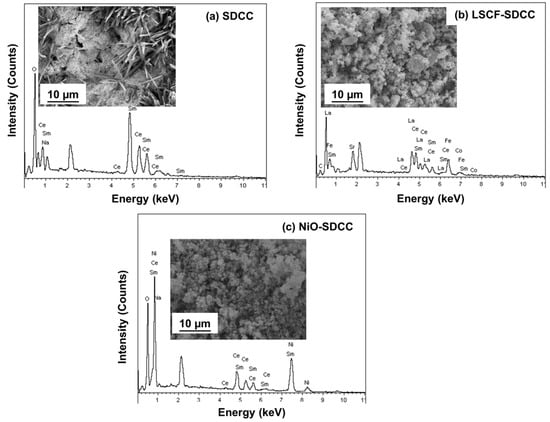 - Shimura, K.; Nishino, H.; Kakinuma, K.; Brito, M.E.; Uchida, H. Effect of samaria-doped ceria (SDC) interlayer on the performance of La0.6Sr0.4Co0.2Fe0.8O3-δ/SDC composite oxygen electrode for reversible solid oxide fuel cells. Electrochim. Acta 2017, 225, 114–120. [Google Scholar] [CrossRef]