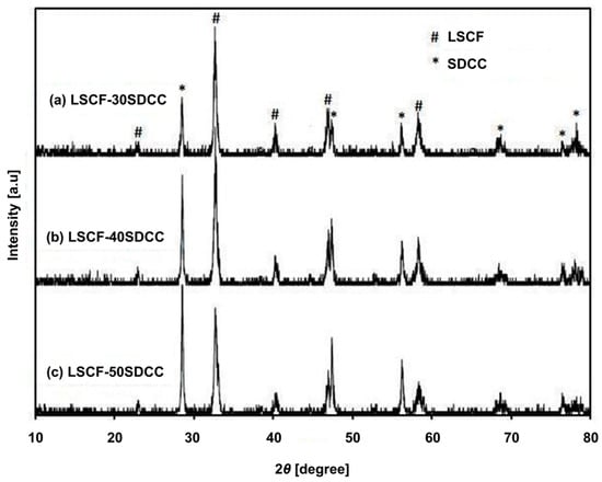 - Rahman, H.A.; Muchtar, A.; Muhamad, N.; Abdullah, H. Structure and thermal properties of La0.6Sr0.4Co0.2Fe0.8O3-δ-SDC carbonate composite cathodes for intermediate- to low-temperature solid oxide fuel cells. Ceram. Int. 2012, 38, 1571–1576. [Google Scholar] [CrossRef]