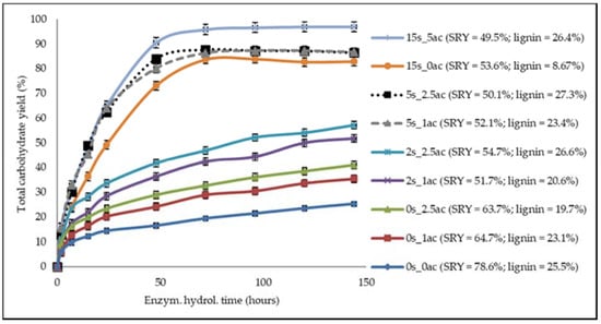 In this figure the uppermost cluster is associated with sulfite charge of 5% or higher, suggesting the role of lignin sulfonation, reported by several authors [,]. In addition, the enzymatic yield in the range 86.6–88.7%, obtained for 5s_1ac and 5s_2.5ac, is higher than that obtained for the 15s_0ac solid residue (82.9%), despite the low lignin content of the 15s_0ac solid residue (6.4.% of lignin vs. 19.5–21.1%; Table 1, SRY column). It should be mentioned, however, that the enzyme charges regarding the carbohydrates in the solid residue 15s_0ac are slightly lower than the charges for the 5s_2.5ac sample, due to the higher lignin content of the last one. These results suggest that the presence of sulfonated lignin in the solid residue, even in very high amounts, does not impair the enzymatic rate and extent, probably because sulfonation decreases the non-productive adsorption of enzymes on lignin [,]. Lignin extraction from the solid residue significantly enhances the process, but it seems that lignin extraction is not a prerequisite for extensive enzymatic hydrolysis, even for relatively low enzymatic charges, as is the case in the present work.