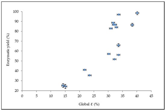 Effect of global porosity (ε) on the enzymatic yield.