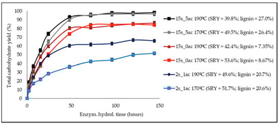 As it can be seen in Figure 3, increasing the pretreatment temperature from 170 to 190 °C increased the initial rate of carbohydrates release during the enzymatic hydrolysis for all tested solid residues, even when the enzymatic hydrolysis extent remained unaffected (15s_0ac and 15s_5ac). Both effects are particularly notorious in the solid residue pretreated with 2s_1ac, where the extent of the reaction was also positively affected (from 51.7 to 65.9% for 170 and 190 °C, respectively), in addition to the initial reaction rate. These results are in good agreement with the increase of the WRV of the solid residues from 1.31 g/g to 1.35 g/g. The corresponding increase in WRV for the 15s_0ac was from 1.39 g/g to 1.51 g/g.