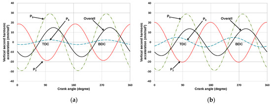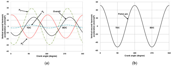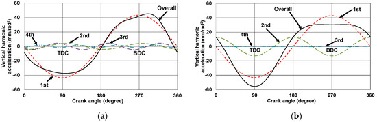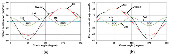 Harmonic acceleration components at the piston pin of slider-crank mechanism: (a) Cylinder 1 and (b) Cylinder 2.