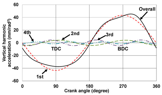 Vertical harmonic acceleration components at piston pin (P6) of the initially designed Stephenson III mechanism in a single cylinder.