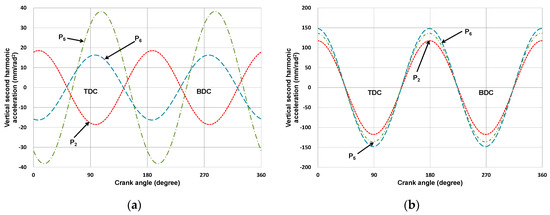 In Figure 9a, the cases that satisfy the specified stroke range given in Table 2 are marked with a box. As shown in Figure 9b, Case 3 of variation number 10 has the lowest maximum sum of vertical second harmonic acceleration components. Hence, the final dimensions were selected from this case. In Table 7, the dimensions, stroke, piston pin position at TDC, and the maximum sums of the second and fourth harmonic acceleration components in the in-line four-cylinder engine are shown and compared with those of the initial design. The maximum of the vertical second and fourth harmonic acceleration sums were decreased by 58.333% and 34.882%, respectively.