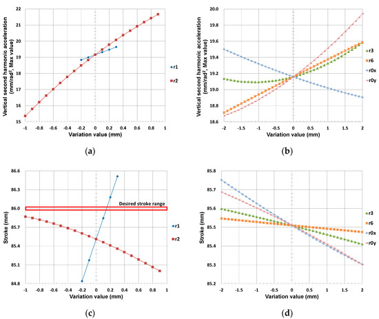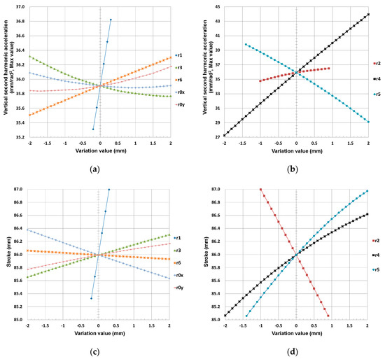 As can be seen from Figure 7a,b, since the lengths of r4 and r5 of the ternary link are more sensitive to the sum of the vertical second harmonic acceleration components, they are selected to adjust their lengths in Step 2: the length of link r4 is taken to its minimum and r5 is adjusted to its maximum within the prescribed tolerance on the link lengths given in Table 5. As Step S3, with the adjusted lengths of r4 and r5 in Step S2, the influences of the change in the length of each link except r4 and r5 are plotted in Figure 8. Figure 8c,d show that the stroke of the Stephenson III mechanism with the adjusted link lengths of r4 and r5 is 85.510 mm, which does not satisfy the design specification 86 ± 0.025 mm given in Table 2.