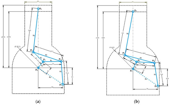 For the design specifications for the VCR engine mechanism given in Table 2, the dimensions of the two candidates are determined using Equations (8)–(24) as shown in Figure 3 and Table 3.