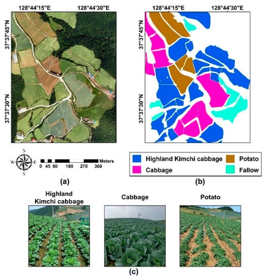 The first case study area is Anbandegi in Korea, one of the major highland Kimchi cabbage cultivation areas in Korea [7]. The crops cultivated in the study area include highland Kimchi cabbage, cabbage, and potato, and several fallow parcels exist. As depicted in Figure 1a, each crop is cultivated within a separate parcel.