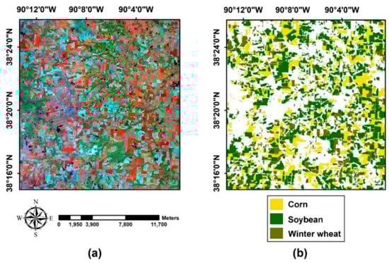 Data sets used for crop classification in Illinois: (a) false color composite (near-infrared (NIR)–short-wave infrared (SWIR)–Red) of Landsat-8 Operational Land Imager (OLI) imagery on 8 April 2017; (b) cropland data layers (CDL) data.