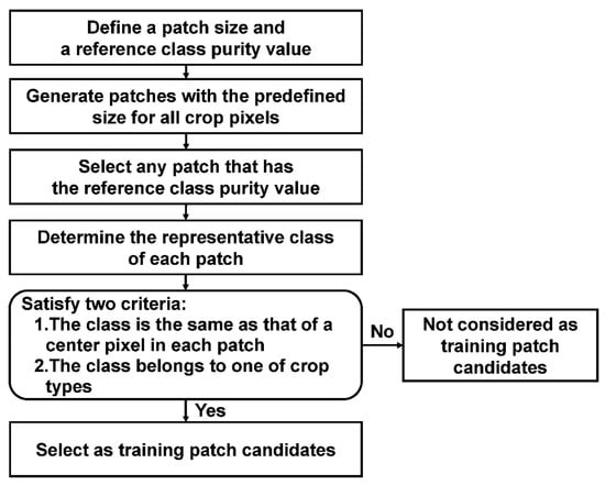 Figure 4 presents a procedure to extract training patch candidates using class purity values for a comparative study. After determining both the patch size and a reference or threshold value of class purity, a patch configuration with a predefined size is overlaid on all crop pixels in an image of interest such that each pixel in the image is the center of the patch. Any patch that has the reference class purity value is then selected. The representative class of each patch is determined by counting the number of the most frequent class in the patch from the ground truth data in the study area. As a result, the proportion of the representative class in the patch is the same number as the predefined class purity value. The training patch candidates can then be selected by applying the following two criteria: (1) the class of the center pixel in a patch should be the same as the representative class; (2) the representative class of the center pixel should be one of the crop types. The final training patches are extracted by applying specific selection criteria.
