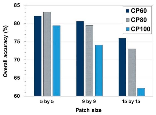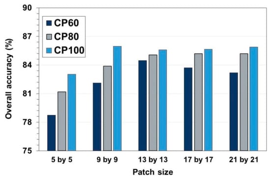 Figure 6 presents the variations in overall accuracy with respect to different patch sizes for each class purity value. As the class purity value increased, the corresponding classification accuracy increased, regardless of the patch size. In particular, when the patch size was small (e.g., 5 by 5 and 9 by 9), the difference in overall accuracy between CP60 and CP100 was larger than it was for large patch sizes (approximately 4.3%p and 3.8%p for patch sizes of 5 by 5 and 9 by 9, respectively). When both the class purity and patch size are small, the LCH within a patch is likely to be large. Consequently, the spatial features extracted from the trained model may fail to accurately reflect the homogeneous spectral patterns of most parcels in the study area, thereby yielding poor classification accuracy. In contrast, as the patch size increases, the training patches have higher LCH values and contain more homogeneous pixels, thereby improving classification accuracy.