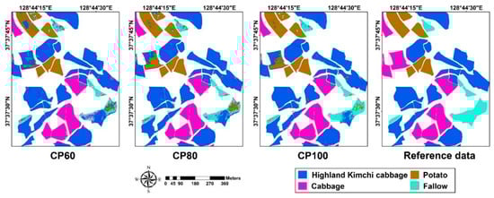 By contrast, misclassification in the potato parcels reduced significantly as the class purity increased. Furthermore, the misclassification of fallow as highland Kimchi cabbage in the southeastern part was alleviated significantly for CP100. However, training patches were selected only inside the parcel for CP100. Hence, these patches might not accurately extract spatial features near the parcel boundaries. Consequently, the sporadic misclassification of highland Kimchi cabbage as fallow or cabbage was observed near the boundaries of highland Kimchi cabbage parcels. The two cabbage parcels in the western part could not be correctly identified, regardless of the class purity values. This misclassification of cabbage as highland Kimchi cabbage and potato was due to the harvest of cabbage in August, unlike other cabbage parcels in the study area.