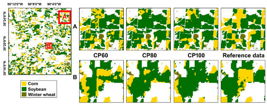 Figure 9 presents the classification results generated using the 9 by 9 training patch that produced a significant difference in the overall accuracy with respect to different class purity values. The classification results generated using other patch sizes and different class purity values in Illinois are presented in Figure S2. The distinctive differences between the classification results for different class purity values can be highlighted in two subareas, denoted as A and B in Figure 9. For CP 100, the exaggeration of soybean parcels and the misclassification of small corn parcels as soybean were observed. This occurred because the training patches selected primarily inside the crop parcels could not provide information regarding the discrimination of different crop types located at the boundary of the parcels. By contrast, the misclassification of corn parcels surrounded by the soybean parcels reduced significantly when using training patches with CP60. When a lower class purity value was applied to select the training patches, those located at the boundary between different crop parcels were primarily selected. Consequently, the 2D-CNN model trained using these training patches extracted spatial features that were useful to discriminate adjacent crops, thereby achieving increased classification accuracy. However, misclassified pixels were identified inside the crop parcels in subarea A of Figure 9, as observed for CP60 in Anbandegi, which is a limitation of using small training patches.