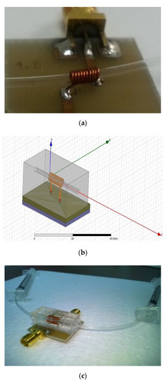 As for catalyst to change the substrate property, thus changing the inductance value, PDMS based microchannel was attached onto the PCB, as shown in Figure 2b. The specification of wire bond solenoid inductor for metal thickness, number of turns, space between turns and bond diameter were 250 µm, 10, 250 µm and 25 µm, respectively.