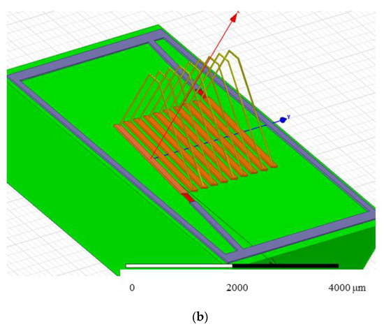The wire bond solenoid inductor is modeled and simulated in High Frequency Structure Simulator (HFSS) as shown in Figure 4a. As can be seen, the metal base is implemented on a ROGERS4003 dielectric. It is recommended to use a relative permittivity of 3.55 for simulation. The wire bonds are modeled, as well, to form the solenoid inductor. Two excitation ports act as the terminals with a common reference ground. A three-dimensional solenoid inductor for both inductor types was designed in the HFSS EM simulation tool. Figure 4b shows the bond wire (bridge) connections on the base part. The PCB used in this work is ROGERS4003, with 0.8-mm dielectric thickness, a relative permittivity of 3.38, a loss tangent of 0.0027, a metal conductor thickness of 18 µm and a metal conductivity of 5.8 × 107 S/m. The metal width at the base is 10 mL with a space of 10mL. The bond wire is gold (Au) with 25 µm diameter. Ferrofluid was injected into the channel, then it remains static in channel during measurement. The characterization of the inductance was performed based on the percentage of liquid in the channel. As explained in Section 3.2, ferrofluid was modeled as solid magnetic bar when the particles were magnetized.