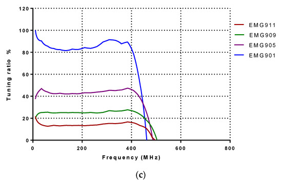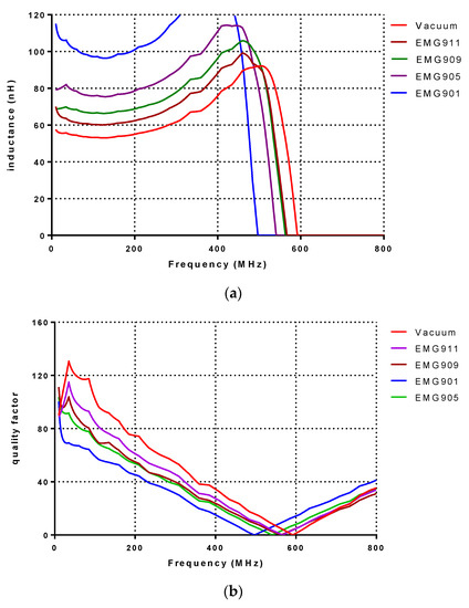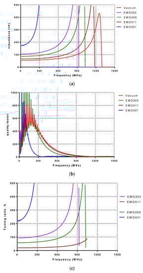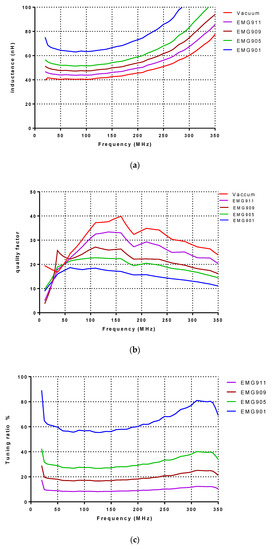 Figure 7a shows the simulated result of the wire bond inductor that varies from 47 to 181 at 200 MHz. For vacuum, EMG911, EMG909, EMG905 and EMG901, the simulated inductances are 47.8, 61.5, 85.5, 107.8 and 286.3 nH at 300 MHz, respectively. The contra result observed is compared to the wire-wound inductor, where, according to Figure 7b, the maximum quality factor obtained is 70 at 350 MHz for EMG901. Figure 7c shows the simulated tuning ratio, where the maximum tuning ratio belongs to the EMG901, equal to 498% at 300 MHz. According to the inductance variations, the minimum and the maximum tuning ratio correspond to EMG911 and EMG901, respectively.
