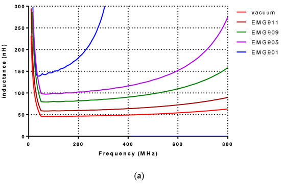 Figure 5a illustrates the simulation results of inductance variation, corresponding to the full injection of the different ferrofluids. As can be seen in this figure, the minimum inductance is obtained at vacuum. When the channel is empty, the core is filled by air, where the permeability is approximately equal to vacuum. As tunable fluidic based inductors, ferrofluids will be used for injection into the core. According to the permeability of the injected liquid, the inductance is varied. In this work, four ferrofluids, referred to as EMG901, EMG905, EMG909 and EMG911, were applied to, respectively, initial magnetic permeabilities of 5.4, 3.1, 1.9 and 1.3, magnetic saturation equal to 66 mT, 44 mT, 22 mT and 11 mT, and magnetic particle concentrations 11.8%, 7.8%, 3.9% and 2%.