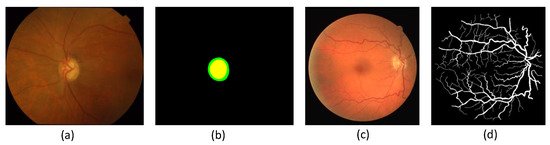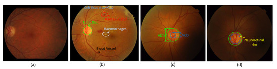 According to WHO statistics, approximately 400 million people worldwide have diabetes. Diabetes can cause serious complications such as glaucoma and retinopathy. Effectively segmenting the fundus image assists the physician in diagnosing the disease. The clinical manifestations of diabetic retinopathy are bleeding spots, hard exudation, retinal microvascular abnormalities, new microvascular etc., as shown in Figure 1a,b, which can cause severe visual impairment [1]. As one of the main causes of blindness, glaucoma is irreversible, and it is expected to affect 111.8 million people in 2040 [2]. Glaucoma is usually evaluated in clinical tests by calculating the vertical cup-to-disk ratio (CDR) [3]. The CDR can be obtained by the ratio of the vertical cup diameter (VCD) to vertical disk diameter (VDD). A normal CDR ranges from 0.3 to 0.4; larger CDRs can indicate glaucoma or other ophthalmic neurological diseases (see Figure 1c,d).