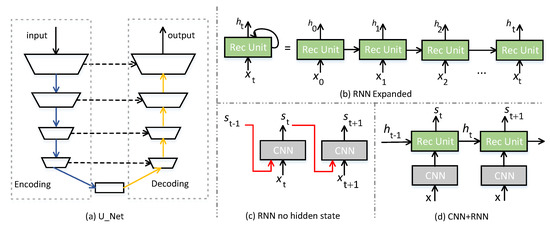 The structure of the U-Net, the recurrent neural network (RNN), and the convolutional neural network (CNN) and RNN in combination. (a) is the U-net structure; (b) is the expended structure of the recurrent neural network; (c) is the recurrent neural network without hidden state; (d) is the structure of the combination of convolutional neural network and recurrent neural network.