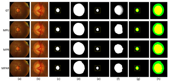 To further prove the improved performance of the model, we propose a hypothesis: the MPAR model performs better than the MPU model and MPA model. We conducted P value analysis on Dice, and the results are shown in Table 4. MPAR:MPU represents the comparison between the MPAR model and the MPU model, and MPAR:MPR represents the comparison between the MPAR model and the MPU model. In the table, MPAR:MPU has a Pvalue < 0.05 for OC and OD, indicating that the MPAR model and the MPU model have statistical significance; that is, the MPAR model performs better than the MPU model. In the table, MPAR:MPR has a Pvalue < 0.05 for OD, indicating that the MPAR model performs better in OD segmentation than the MPR model.