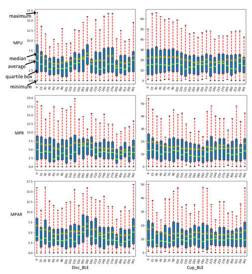 Table 5 shows the BLE errors of the segmentation results of each model. As can be seen from the table, the results of the MPAR model are better than the MPU model and the MPR model. Especially for the video cup, comparing MPAR with MPU, the BLE error is reduced by 6.242 pixels, which also shows that the model in this paper can segment the video cup more accurately. BLE error plays a crucial role in the evaluation of the model. This paper shows that the BLE was 360∘ (each 15∘). Figure 6 shows the average error, median, maximum and minimum error, and quartile box of each test picture in the same orientation.