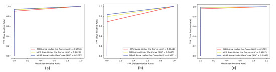 This paper compares the receiver operating characteristic curve (ROC) curves of different models in the optic cup and joint optic cup segmentation, as shown in Figure 7. The MPR model has an increase in the area under the curve (AUC) of the optic disc by 0.0441 compared with the MPU model. The MUC model increased the AUC for the optic cup by 0.01 compared to the MPR model. The AUC of the MPAR model for joint optic disc segmentation was 0.9957.