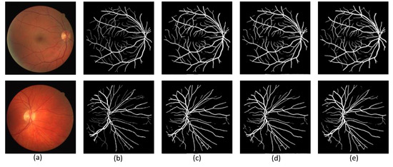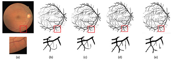 The DRIVE dataset consists of 40 retinal fundus blood vessel images, corresponding real labeled images, and corresponding masks images. The images originate from a diabetic retinopathy screening program from the Netherlands, and each image has a size of 565 × 584. As shown in Figure 4c,d, for the DRIVE data set, during the training process, 10,480 image patches of size 128 × 128 are randomly extracted for the training set. At the same time, 10,480 real label patches with a size of 128 × 128 are extracted from the corresponding real labels at the same location to calculate the loss and train the network. The input image batch size is 16 and the iteration period is 200. In the test phase, this article extracts image patches for each test picture of each dataset in a sliding window order. The size of the sliding window is 128 × 128, the sliding step is 5 pixels, and the part of the sliding window beyond the picture is filled with 0. Similarly, the batch size of the image input to the network is 16.