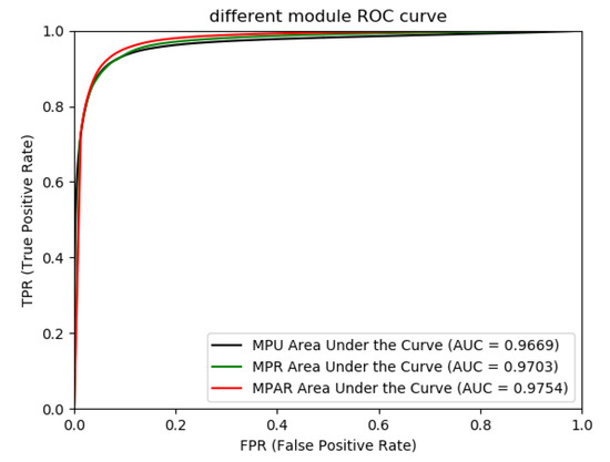 Figure 8 is an effect diagram of the blood vessel segmentation by each model. As shown in the figure, the MPAR model can effectively segment the small peripheral blood vessels effectively. and at the same time, it can more completely segment the blood vessels, reducing the problem of blood vessel rupture during segmentation. Figure 9 shows the ROC curve of each model on the DRIVE data set. Comparing the MPA model and the MPU model, the AUC area increased by 0.0034, and the MPAR model AUC area was 0.9754.