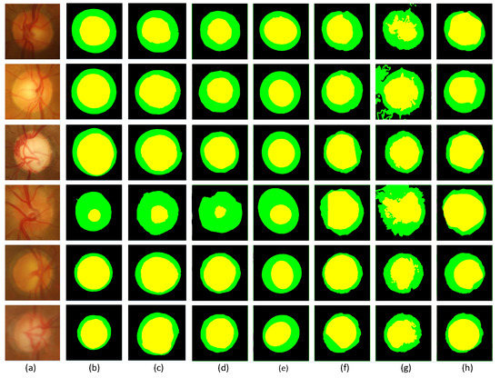 Comparison of different method model segmentation images of the Drishti-GS1 dataset. (a) is the original image; (b) is the ground truth; (c) is the result of the method in this paper; (d) BCRF [46]; (e) Superpixel [44]; (f) Multiview [45]; (g) Graph Cut prior [51]; (h) Vessel bend [43].