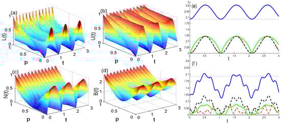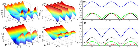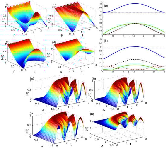 The 3D-evolution of in (a), in (b), in (c) and in (d) when , and for the cases: with in (a,b), and with in (g–k). The 2D-evolution of (dashed plots), (dashed dotted plots), (upper solid plots) and (solid plots) for in (e) and in (f).