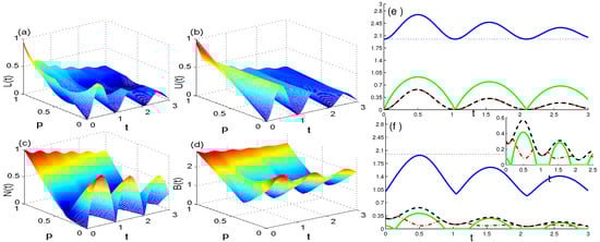 The green solid curves of Figure 4f, with the phase damping, show that the log-negativity suddenly vanishes completely for a finite time and then it undergoes rebirth again. These phenomena of the sudden death and sudden birth of the entanglement [42,43] are observed only for the log-negativity entanglement for several finite periods (see the nest figure). Moreover, the phase damping leads to increase of the partial SI correlation intervals and to the completely vanishing of the maximal violation of the Bell’s inequality. For , the 3D plots of the Figure 4a–d show that the purity indicator accelerates the effect of the the phase damping.