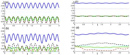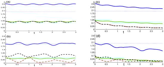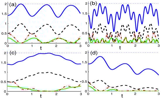 The (dashed plots), (dashed dotted plots), (upper solid plots), and (solid plots) for and with the cases in (a); = (3, 1.5, 0.0) in (b); = (0.5, 0.5, 0.0) in (c) and in (d).
